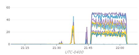 So was that the end of the load balancing issues? Not exactly. Once we had our basic gRPC-based system up and running we started running load tests against it, and noticed some interesting behaviors. Below is the per gRPC server CPU load graph over time, do you notice anything curious about it?